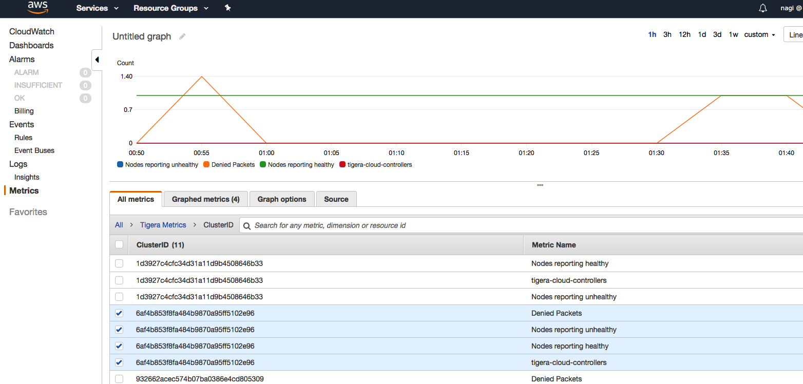 Just as in the screenshot, you should now see CloudWatch graphing various statistics such as denied packets, unhealthy nodes, etc.